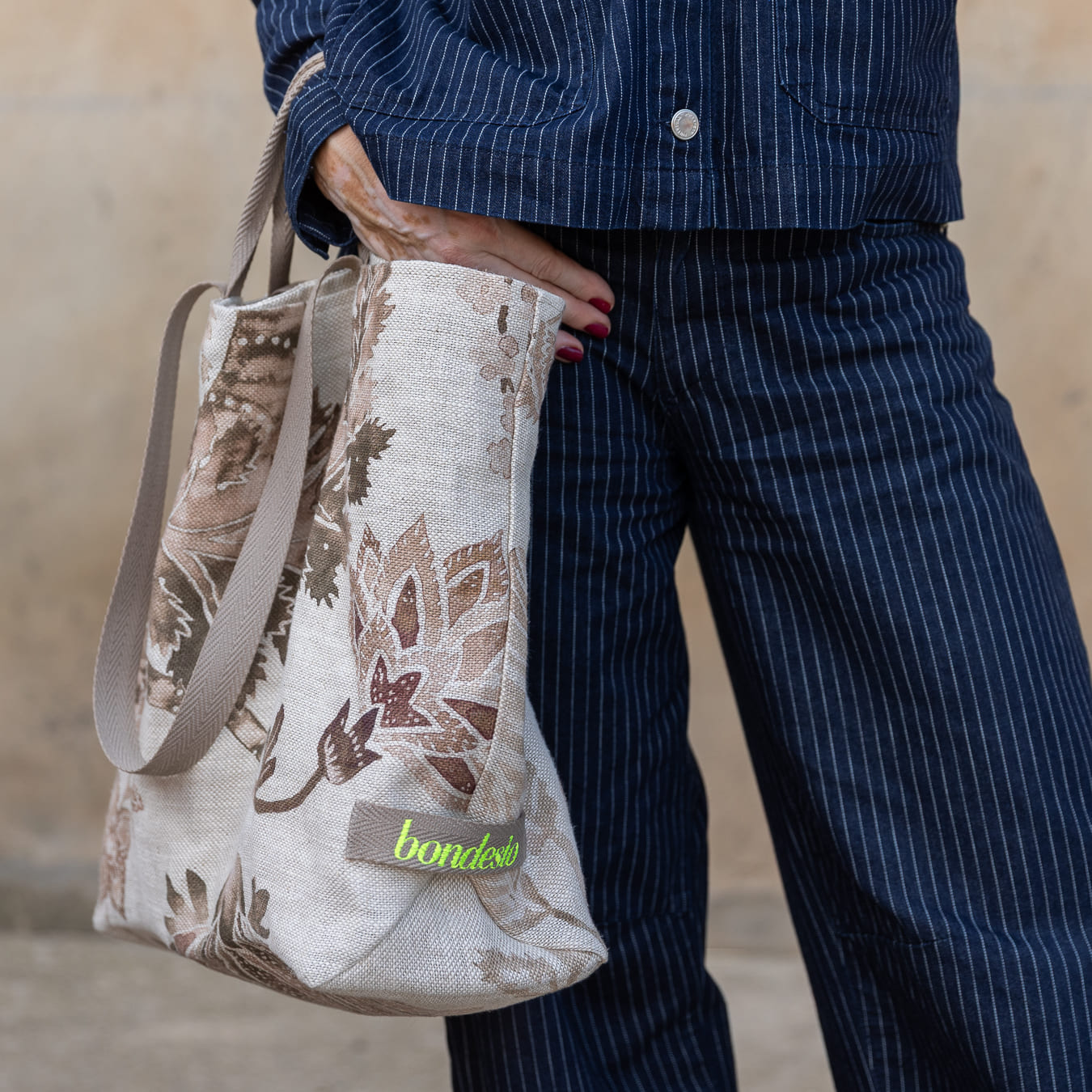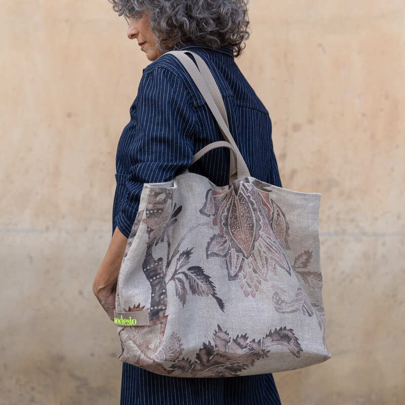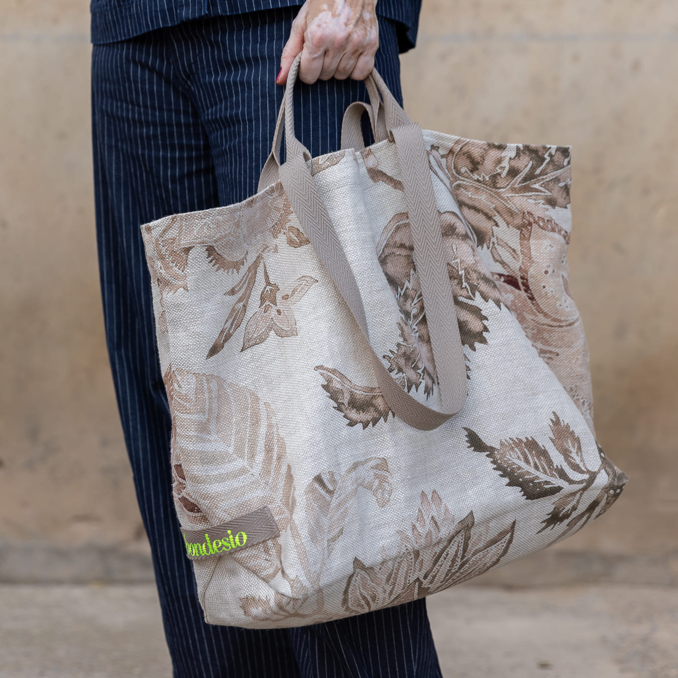 El nuevo bolso Cristina tamaño XXL, confeccionado en tejido de lino natural con estampado floral y una paleta de colores tierra y naturales, perfecta para looks atemporales y versátiles.