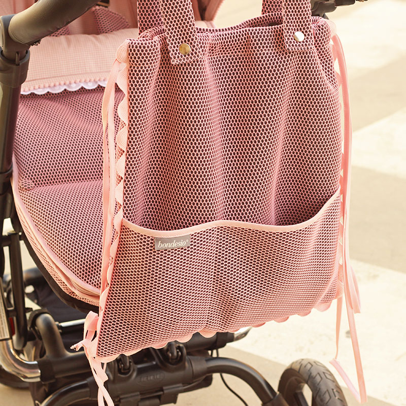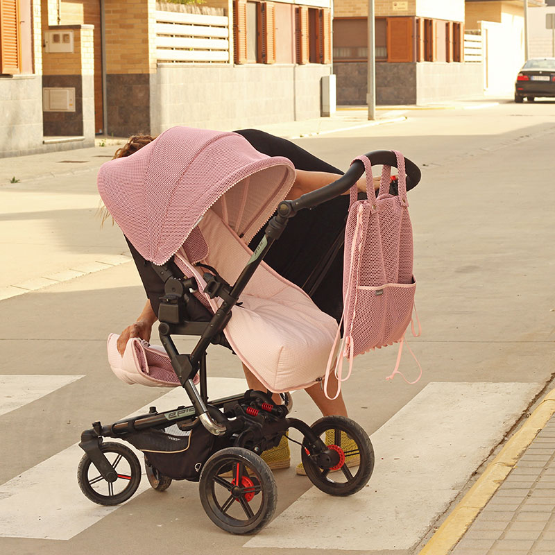 Sin ninguna duda nuestra mochila Brisa, en su opción versátil, te dará mucho juego a ti y a tu bebé. La podrás llevar colgada del carrito como en la imágen, en tu espalda o como shoppingbag, simplemente cambiando el modo de abrochar los corchetes de sus asas.