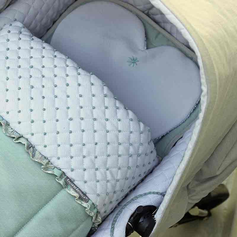 De lo más guapico va Juan paseando en su Bondesio, que le hemos confeccionado en el taller con tejidos piqué liso, pique bouti y otomán. Como no podia ser de otra manera minuciosamente y uno a uno hemos bordado a mano nudo francés y cadeneta en tono verde agua. A juego con el coordinado tambien le hemos confeccionado nuestro clásico bocaditas corazón, bolso modelo Martina y portadocumentos bordado con su nombre, para tener a mano y ordenados todas sus cositas. En cada Bondesio que confeccionamos nos reinventamos, para que ninguno sea igual y todos sean tan especiales como lo son vuestros bebés.